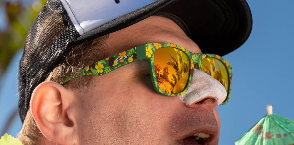 At goodr, we all recognize that crazy look Carl The Flamingo gets in his eyes. Whenever he smells coconut, he goes mad with desire, throwing wild tropical tantrums until he gets his fix. Quick, put on these floral-patterned sunnies and take a vacation day. Otherwise, you might get stuck listening to eight hours of Carl's ukelele protest songs. No one wants that.