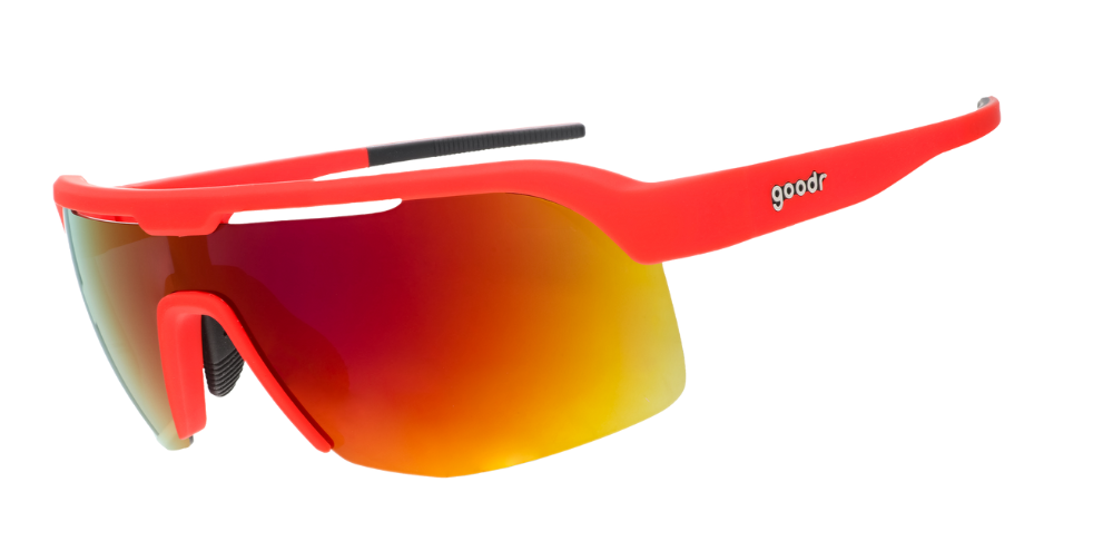 Residents of Dante's fiery inferno are doomed to suffer shin splints that burn like hell for all eternity. Don't worry, though. These red shield, half-rim frames w/ rose reflective lenses won't slip or bounce no matter how schweddy it is there.