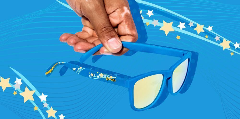 Making up spells is super fun. Curtangi Letangi! What they all mean, who knows exactly, but it's real magic so don't tread too lightly around anyone shouting spells wearing this beautiful blue frame, yellow lens, magical wand and star printed wizard stunners. Abracadamn! Aloe Kazamn! Oh, that one sounded dangerous... and medicinal at the same time.