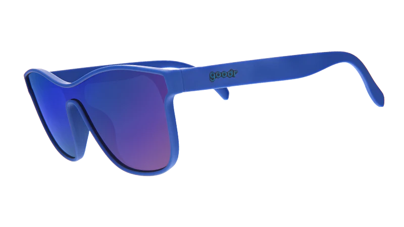 In a nod to the future, these blue and purple sunglasses will teleport you to the enchanted rave of your dreams where you will dance until you are crystallized forever in a glittering dystopian paradise!!! VRGs with mirrored reflective lenses...the future is NOW.